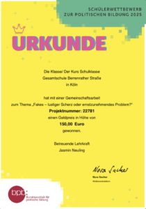 Schüler*innenwettbewerb zur politischen Bildung: Klasse 7c gewinnt 150 Euro 12. März 2026 - Fakes – ein lustiger Scherz oder ein ernstzunehmendes Problem? Mit dieser Frage hat sich die Klasse 7c im Rahmen eines Demokratieprojekts intensiv beschäftigt. Anlass war die Teilnahme am bundesweiten Wettbewerb zur politischen Bildung. Für ihre überzeugendeRead More...