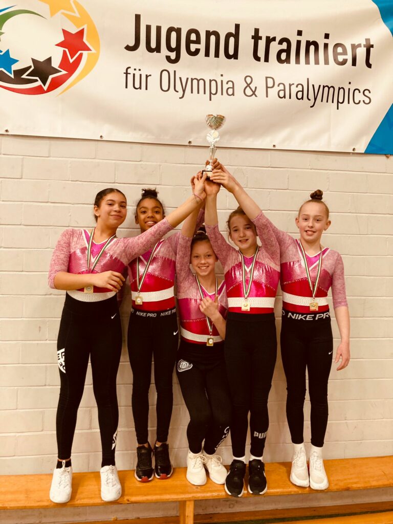 Unsere Turn-Mädchenmannschaft musste in diesem Jahr in einer höheren Wettkampfklasse (WK III) mit anspruchsvolleren Übungen am Schwebebalken, am Stufenbarren, Sprung und einer musikalischen Boden-Kür antreten. Verletzungsbedingt fiel ein Mannschaftsmitglied aus. Doch diese Herausforderungen meisterten die füng Turnerinnen in besonders guter Weise, sodass im Januar der Stadtmeister-Titel und im Februar der Bezirksmeisterschafts-Titel in Bergisch Gladbach gewonnen wurde. Im März stehen nun die NRW Landesmeisterschaften an und vielleicht gelingt mit einem weiteren Erfolg wieder die Final-Runde auf Bundesebene in Berlin. Herzlichen Glückwunsch für diese erneute herausragende Leistung.