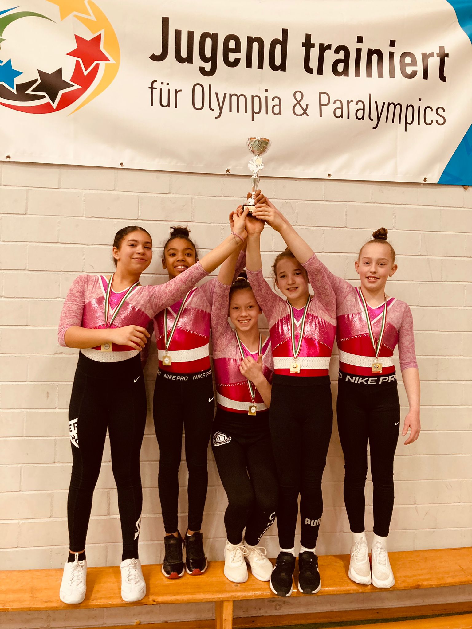 Unsere Mannschaft hat es geschafft! Die fünf Turnerinnen haben beim Bundesfinale von Jugend trainiert für Olympia den 1. Platz gewonnen und sind damit Deutsche Meisterinnen im Geräteturnen!