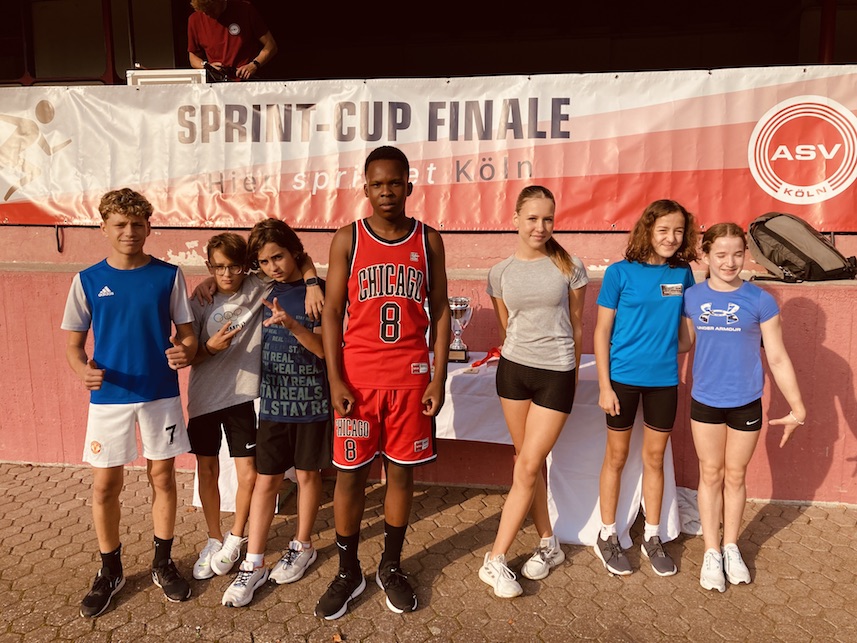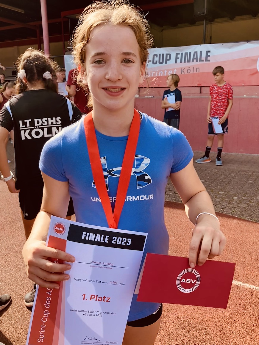 Am 12. September 2023 fand das Finale des ASV-Sprint Cups auf dem Sportgelände unseres Partner-Vereins ASV statt. Giuliano Vecce, Ana Ceko, Argentino Kwiek, Lilli Reingruber, Onymaechi Aghedo, Lisanne Hornung, Valentin Roth und Inaky Puertas-Poyatos nahmen als schnellste Läufer unserer Schule teil und zeigten auf den fliegend gesprinteten 15 Metern ihre Sprint-Stärke. Während Ana (2,05 sek) und Giuliano (1,84 sek) ihren Endlauf nur um eine Hundertstel leider sehr knapp verpassten, erreichte Lisanne Hornung mit 2,05 sek in ihrem Jahrgang den Finallauf und erkämpfte sich spektakulär in einem 40-Meter-Sprint auf den letzten Metern den Gesamtsieg. Lisanne ist damit die schnellste Sprinterin Kölns Jahrgang 2012. Herzlichen Glückwunsch an alle Sprinter/innen für diese sehr guten Leistungen!